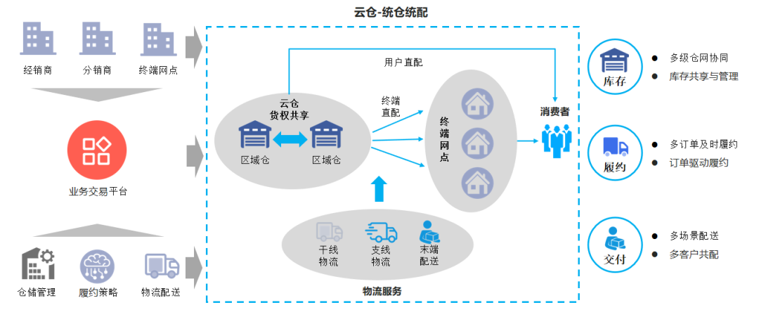 在完成线上的下单以后,接下来的订单履约和货物配送的时候,很多品牌商企业会围绕着传统意义上的配送机制运行,就是从品牌到经销商,再到终端网点,这样逐层的配送机制。