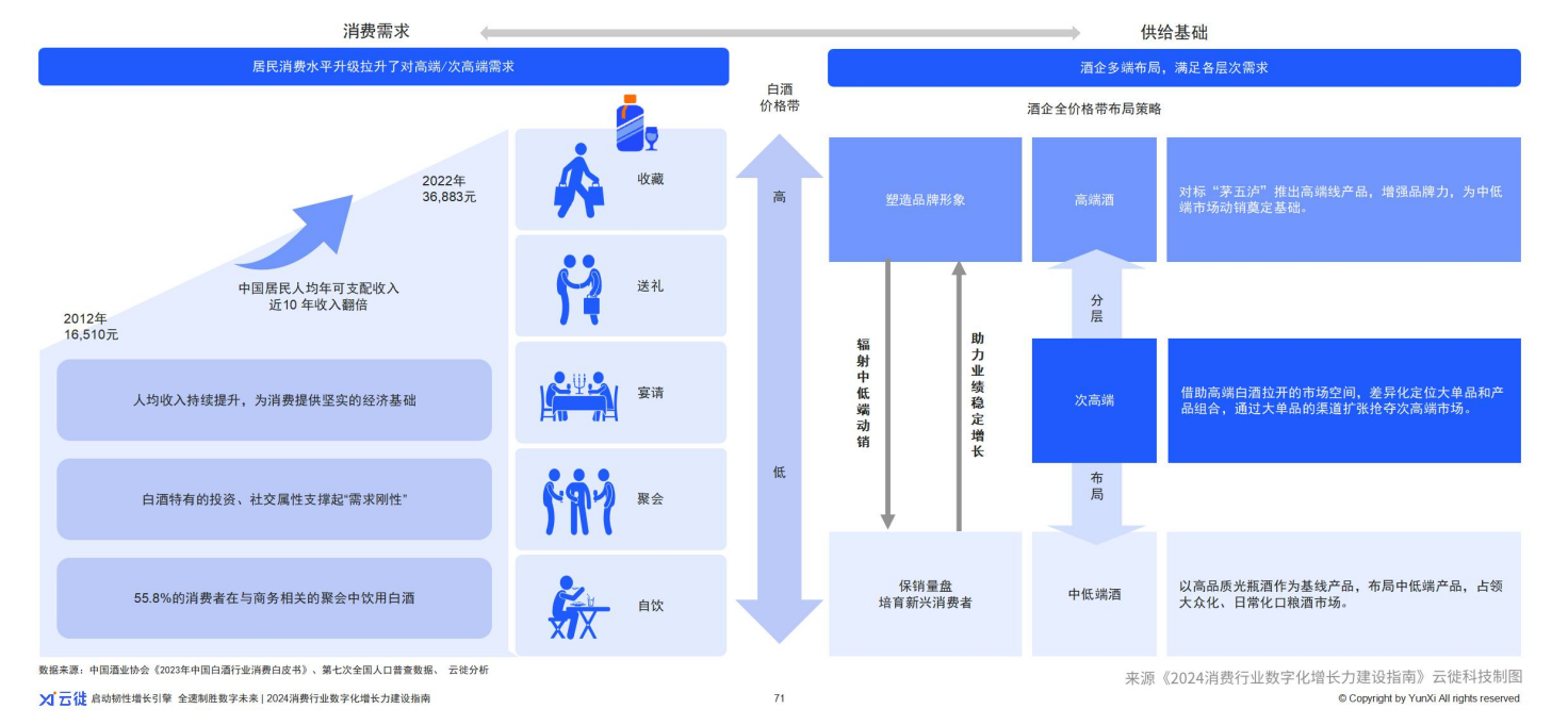 白酒作为中国传统的酿酒文化的代表,承载着千百年来的历史与传承。它不仅是一种饮品,更是一种文化的象征。白酒不仅口感醇厚,回味悠长,线下餐饮、聚会、宴请、送礼等社交场景都有白酒的身影。随着“少喝酒,喝好酒”健康意识提升,消费者酒类消费从价格敏感向价值敏感方向倾斜,更讲究独特的白酒文化属性和产区属性,高端/次高端白酒需求得以保持旺盛。因此,随着消费升级,白酒市场进入快速分化时代,部分白酒品牌出现价格倒挂现象,存量竞争加剧。这从正面要求酒企尽快进行企业转型升级,在供给端多端布局,多点驱动,用高端产品提高品牌影响力;同时拉开次高端和中低端市场空间,次中高端市场占领社交需求,而中低端市场占领大众化、日常化口粮需求。